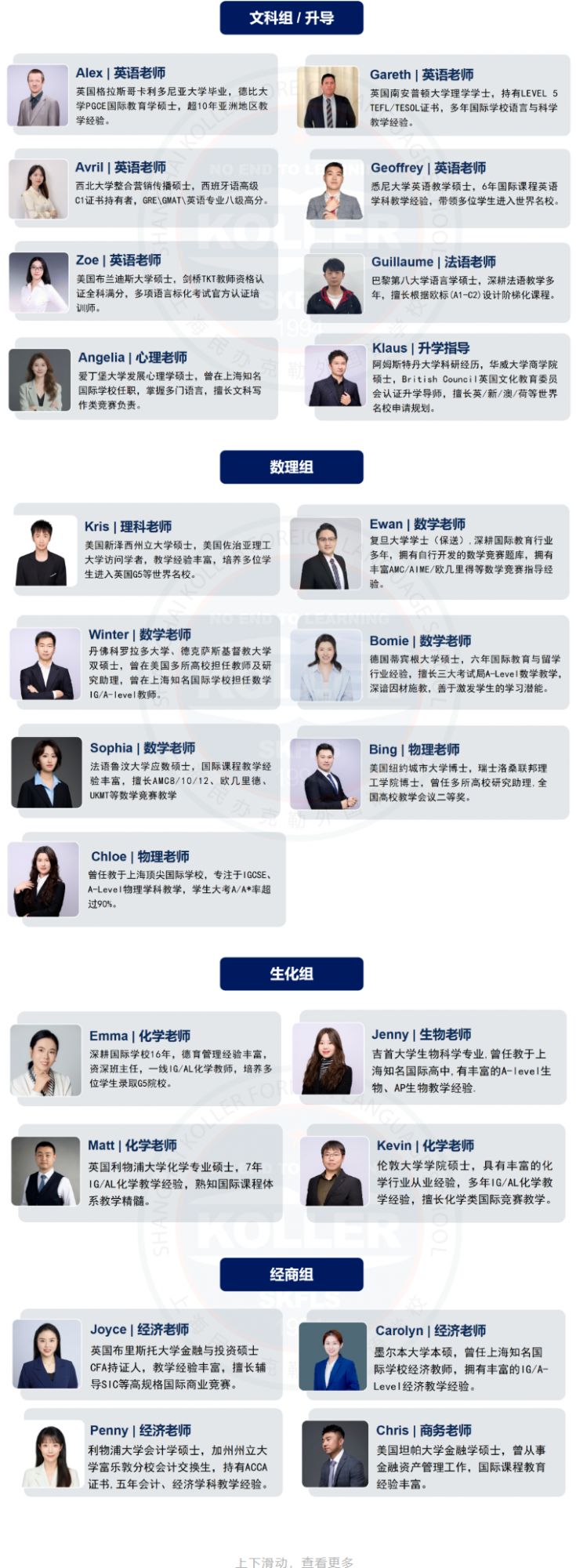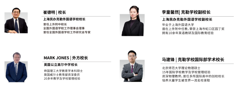 克勒國際部的管理團隊由四位校長組成,他們各司其職、協(xié)同發(fā)力,以專業(yè)能力與國際視野為國際部的發(fā)展保駕護航??死諏W(xué)校校長崔德明全面統(tǒng)籌國際部發(fā)展,英國高爾中學(xué)校長Mark Jones深度參與課程設(shè)計與教學(xué)監(jiān)管,克勒學(xué)校副校長李童馨然與克勒國際部學(xué)術(shù)校長馬建鋒則共同承擔(dān)教學(xué)質(zhì)量與發(fā)展方向的全程把控職責(zé)。